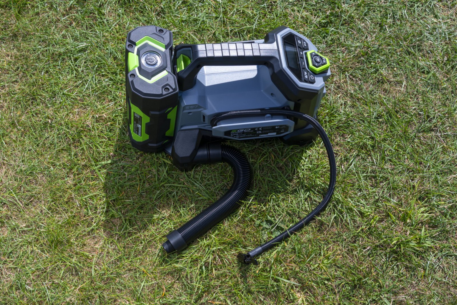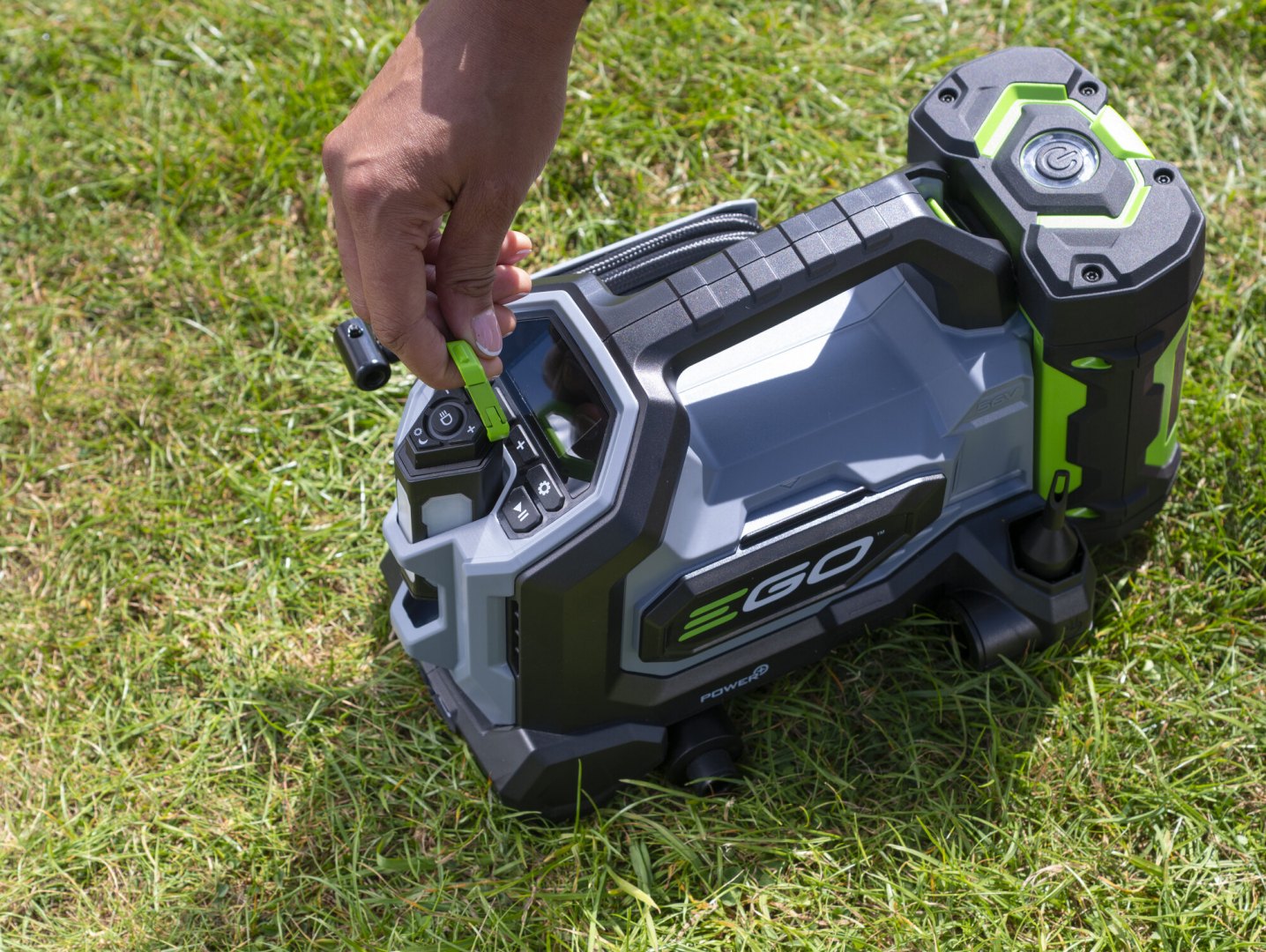 • Díky tomuto kompaktnímu kompresoru získáváte další z možností jak využít bezkonkurenční sílu technologie lithiových baterií EGO jinak, než pouze pro napájení zahradní techniky. Do slotu na baterie umístětě jakoukoliv systémovou baterii EGO Power+ 56V Arc a získáváte tak zdroj vzduchu pro nafukování jak tlakové, tak i objemové. Můžete snadno a citlivě nafouknout cokoli od pneumatiky automobilu až po nafukovací matraci. Kompresor umožňuje zvolit optimální režim ze dvou možných - režim s vysokým objemem vzduchu a režim vysokého tlaku. Kompresor je schopen vyvinout maximální tlak v úrovni 160 psi (11 Bar) a max. průtok vzduchu 300 L/min při 2,5 Bar. EGO IF1600E nahustí automobilovou pneumatiku o rozměru 235/65 R17 na 2,0–2,5 baru za méně než 70 sekund.