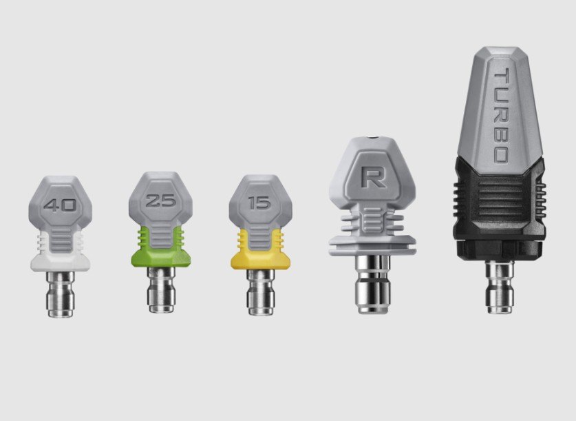 Všechny trysky jsou opatřeny bajonetovým zámkem, který umožňuje rychlou a snadnou výměnu. Konstrukce každé z trysek je optimalizována a tvaruje proud vody tak, aby odpovídal konkrétnímu způsobu mytí a zabraňoval atomizaci vody, tzn. rozprašování vody v podobě mikročástic vodní mlhy.